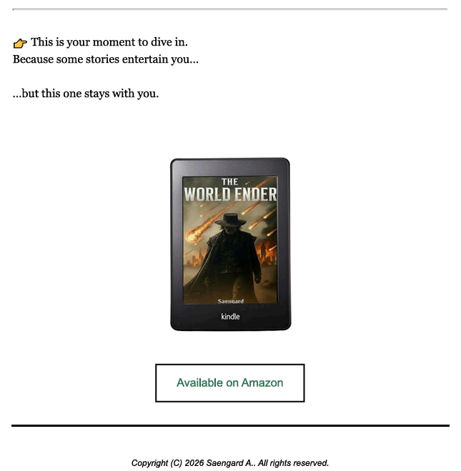 Saengard is the author of The World Ender, an apocalyptic sci-fi thriller. This debut novella began over 25 years ago as a small comic strip in a monthly periodical in Sarasota, Fl. Since then, the story has grown into a series. But don't worry, every book is a satisfying stand-alone story, each one in the series building on the last, charting the rise and fall of Meteora - also known as Punk City.